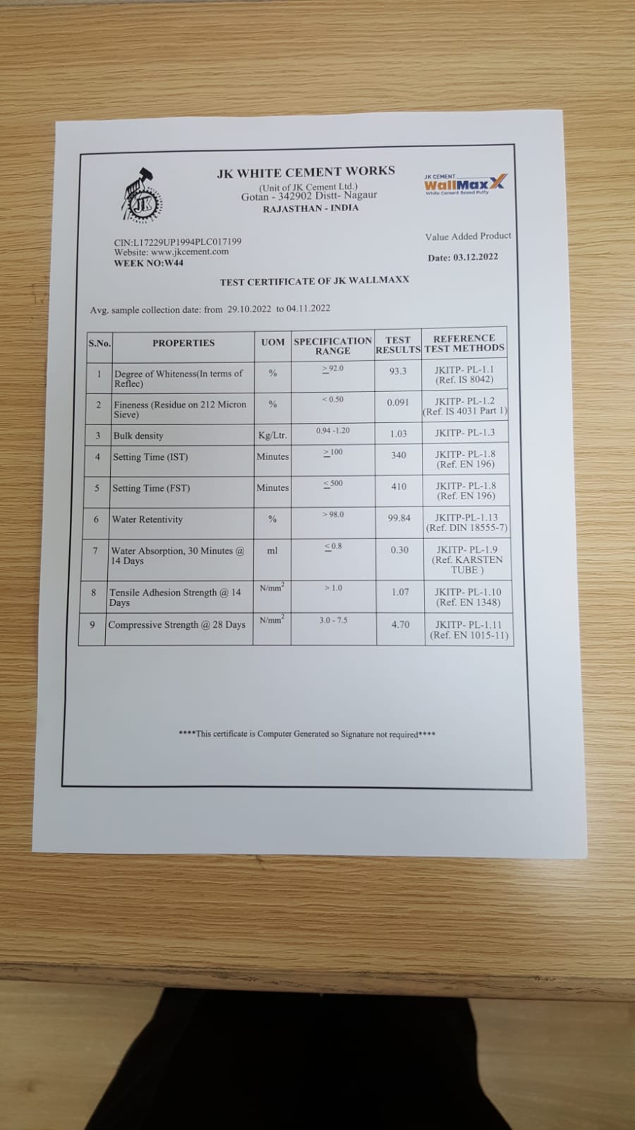J K Wall putty is a white cement based fine powder. It is a mixture of white cement, standard sand and other ingredients. Wall putty provides ideal fishing for concrete/ cement plastered wall and ceiling. It provides ideal base for painting
